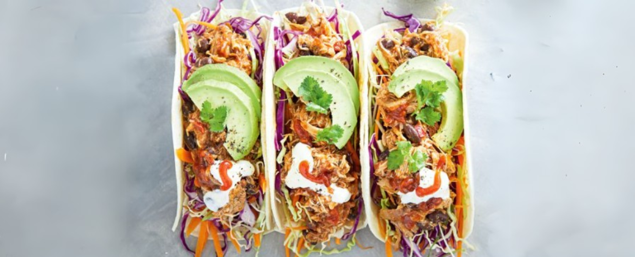 - Top the tortillas with the coleslaw, chicken mixture, avocado, fresh coriander and sour cream. Drizzle with chilli sauce, if using. Serve with extra lime wedges.
